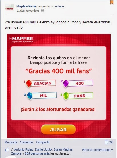 MAPFRE Perú y su comunidad en Facebook celebran sus 400 mil fans y con este motivo Inquba Agencia Digital creó un mini juego-post (el primero hecho en Perú) donde los seguidores digitales de la marca aseguradora pasarán un momento divertido.